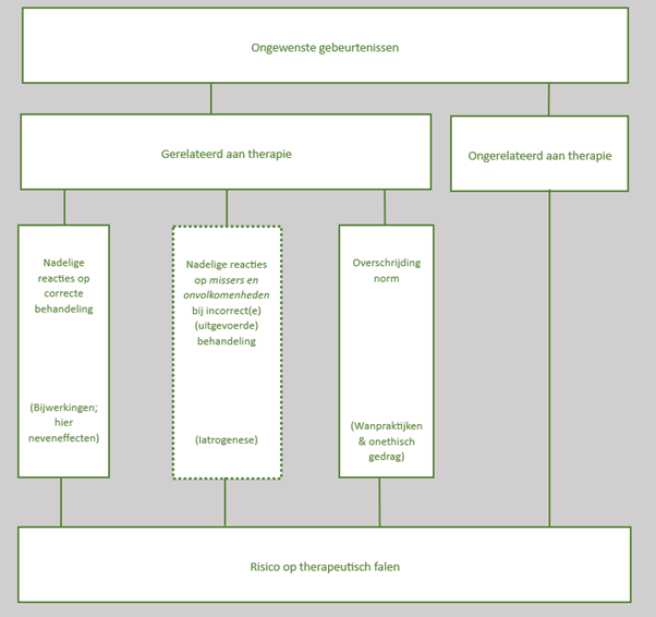 Figuur 1 toont een classificatie van ongewenste gebeurtenissen tijdens de behandelperiode (Linden, 2013). Ongewenste gebeurtenissen kunnen worden onderverdeeld in ervaringen die zich voordoen tijdens de behandelperiode, maar niet gerelateerd zijn aan de behandeling, bijvoorbeeld een plotseling verlies van een naaste, en ervaringen die wel gerelateerd zijn aan de behandeling. Bij deze laatste categorie wordt verder onderscheid gemaakt tussen correct en incorrect toegepaste behandelingen en overschrijding van de norm (Herzog et al., 2019; Linden, 2013; Merckelbach et al., 2018). Een neveneffect is een nadelige reactie op correct uitgevoerde behandeling, zoals een toename van angst bij exposure therapie. Een nadelige reactie bij incorrect(e) (uitgevoerde) behandeling, oftewel iatrogenese (zie Figuur 1), is bijvoorbeeld een pseudoherinnering na suggestieve hypnose (Merckelbach et al., 2018). Daarnaast zijn er nog wanpraktijken, waarbij gedacht kan worden aan gebrekkige dossiervoering en onethisch gedrag, zoals verbaal of seksueel geweld, hetgeen “overschrijding van de norm” omvat.