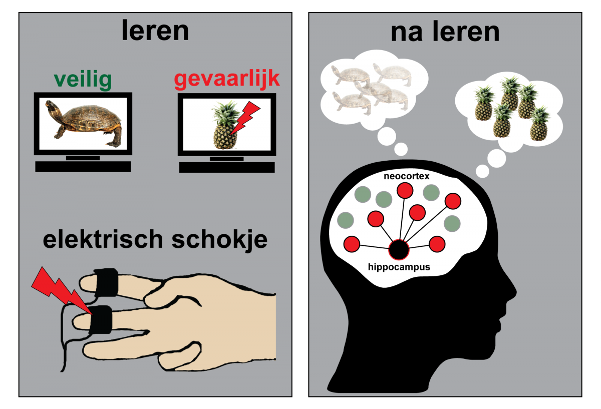 Figuur 1 – Een visualisatie van het experiment van de Voogd et al., 2016. Linker paneel: In het experiment leerde proefpersonen dat de fruit-afbeeldingen een elektrische schok voorspelde en daarbij gevaarlijk waren. De dieren-afbeeldingen waren altijd veilig. Rechter paneel: Na het leren waren de hersengebieden die betrokken waren bij waarnemen van de gevaarlijke fruit-afbeeldingen op dezelfde manier actief als toen de proefpersonen naar de fruit-afbeeldingen keken en schokjes kregen. De gevaarlijke fruit-afbeeldingen werden dus opnieuw afgespeeld in die hersengebieden. Dit was niet het geval voor de hersengebieden die betrokken waren bij het zien van de veilige dieren-afbeeldingen.